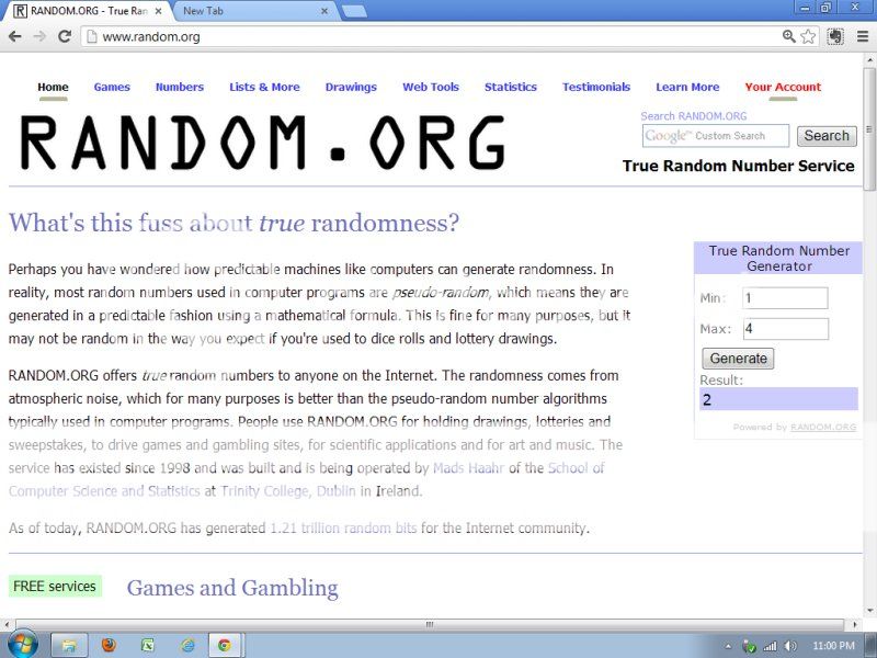 The winning entry was chosen via random.org. Here’s a screenshot of the True Random Generator.