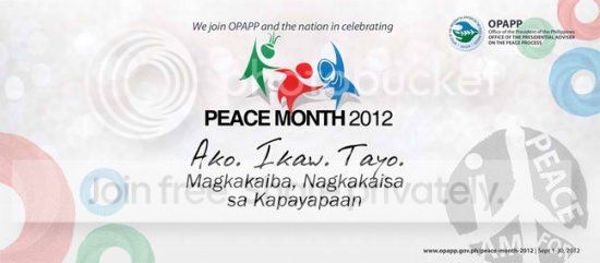 The “I am for Peace” campaign is one of the major activities the Office of the Presidential Adviser on the Peace Process (OPAPP) has lined up in this year’s celebration of the peace month themed “Ako. Ikaw. Tayo. Magkakaiba, Nagkakaisa sa Kapayapaan.” For 2012, the Philippine Amusement and Gaming Corporation (PAGCOR) serves as the official sponsor of the month-long festivities.