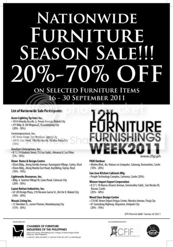 In celebration of 12th Furniture Furnishings Week, the Chamber of Furniture Industries of the Philippines (CFIP-National), in cooperation with CFIF and CFIP-Pampanga, is holding a nationwide furniture sale. In its last 2 days of the sale, you can avail of high quality furniture products from selected furniture companies up to 70%off!